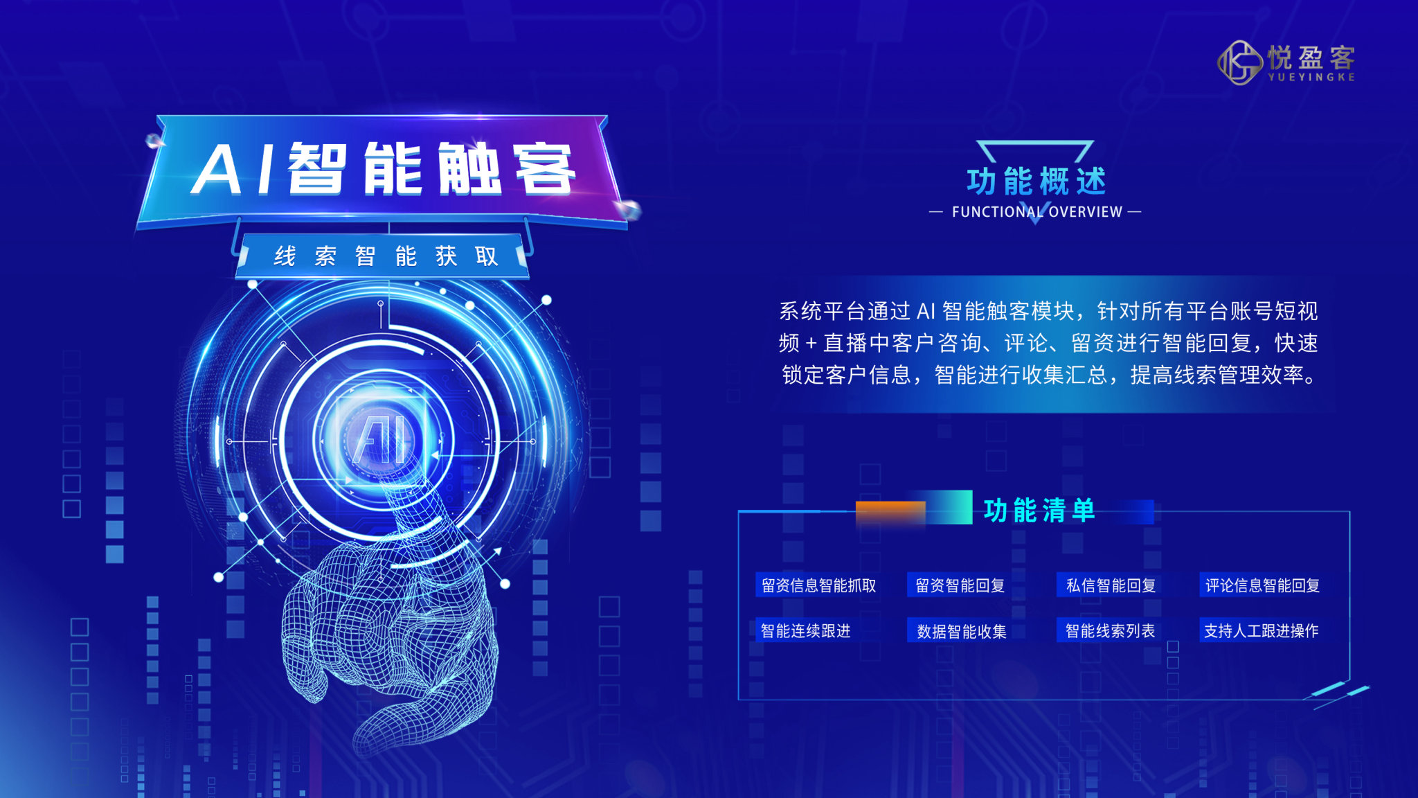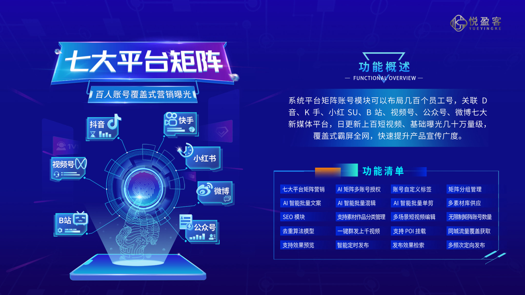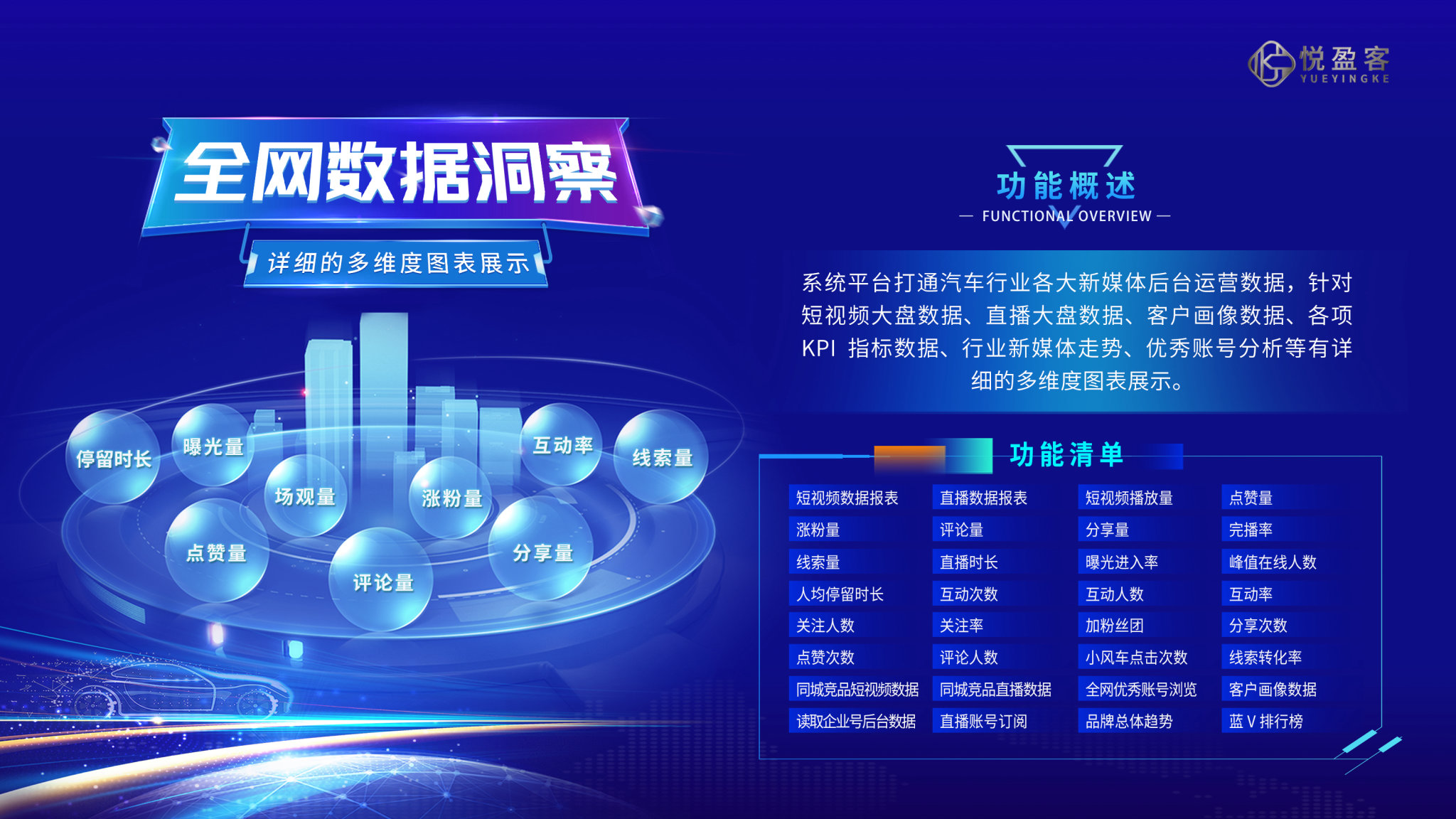 悅盈客-新媒體AI矩陣獲客平臺是我們通過國際先進的AI技術模塊和8000余家汽車品牌店新媒體運營調研需求之后,開發的一套專業SAAS獲客軟件系統,我們產品精準定位汽車新媒體領域全維度獲客管理平臺,創新迭代新媒體運營效率,通過AI矩陣搭建+AI智能觸客+AI智能線索+Hooks+全網數據洞察+智能管理,六大核心功能顛覆式營銷呈現,完美解決汽車品牌在新媒體七大主流平臺批量宣傳、覆蓋曝光、流量攔截、線索獲取+成交、運營監測和數據化管理全鏈路管理需求。